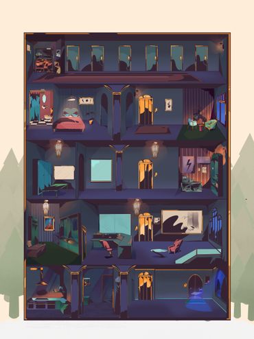 "An old motel lies between the trees of a dark forest, through heavy mists- and miles away from any named town: a place unlikely to receive many spontaneous visitors, and a home for some shady types. As the moon begins to rise, and the sky transforms to deep blue, the clock strikes midnight, and the groundskeeper’s night shift begins. Ben’s Monster Manual is an interactive experience that combines exploration and gamification, that shifts Between two dimensions- Augmented reality, and the print. The human world- and the monster's world".